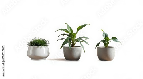 © Photo zone, Obraz premium White round planters with succulent, lush bush and deciduous plant on an isolated background. Botany, phytodesign, web banners