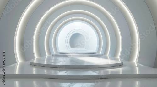 © Ahmed, Obraz premium White round tunnel podium abstract background. Light reflection stage. 3d render