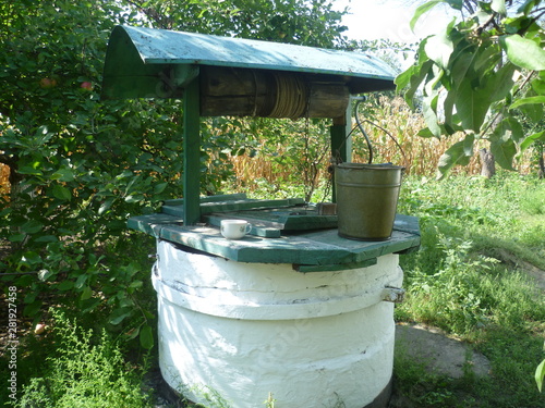 © Сергій Правда, Fototapeta premium white rural well on the background of trees. screen saver on your desktop