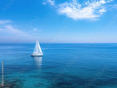 Obraz premium White sailboat gliding on calm blue sea under a bright sky with soft clouds...