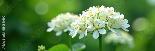 © Sarayuth, Obraz premium White Sambucus nigra umbrella flowers with a few scattered seeds, sambucus, white