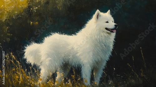 Fototapeta premium White Samoyed Dog in Field Artistic Painting Canine Portrait