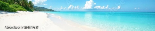 © Pat, Obraz premium White sand beach, clear shallows, distant island silhouette, sunlight, turquoise, sunny