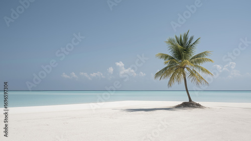 Obraz premium White sand beach with a single palm tree, minimalist framing.