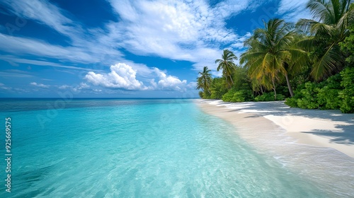 Naklejka premium White sandy beach, turquoise clear water, lush green palm trees, vibrant blue sky, serene and tropical paradise, peaceful and relaxing atmosphere, high-resolution photograph, wide-angle lens.