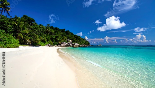 Fototapeta premium White sandy beach with turquoise water and lush green hillside, bright blue sky with scattered clouds