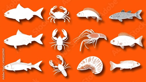 © OleksandrZastrozhnov, Naklejka premium White sea creatures on vibrant orange background