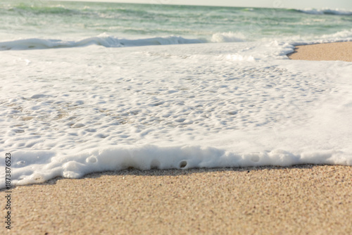 Fototapeta premium White sea foam with wave splashing on shore at beach on sunny day