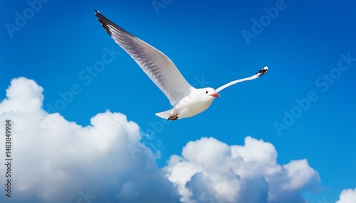 © Benjamin, Obraz premium white seagull against the background of blue sky and white clouds