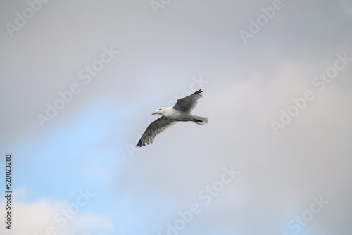 Fototapeta premium White seagull flying high on beautiful blue sky with cloud.