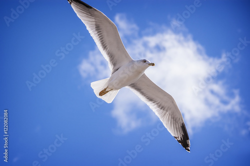 © otaraev74, Obraz premium White seagull flying on blue sky background at the beach.