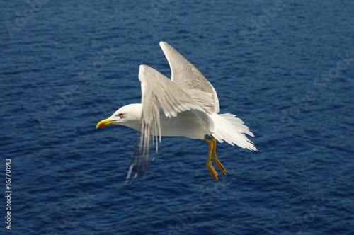 Obraz premium White seagull flying over the blue sea.