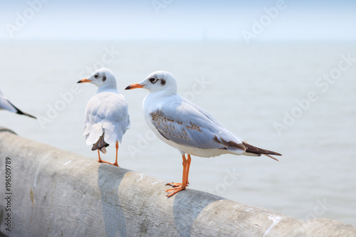 Fototapeta premium White seagull standing on the bridge in nature background.