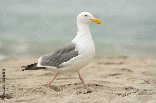 © MikeFusaro, Obraz premium White seagull walking on sandy beach