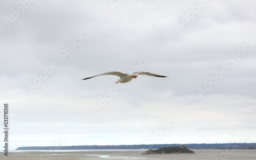 Fototapeta premium white seagull with yellow beak flying free in the sky above the promontory