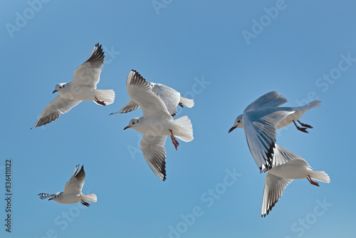 © Valerii, Obraz premium White seagulls soaring in the air against the blue sky