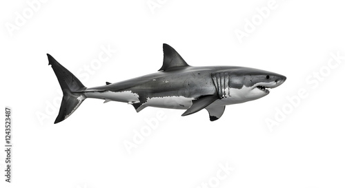 © Benjamin, Fototapeta premium white shark captured in a dynamic swimming motion, its sleek body and powerful tail cutting through the empty white space