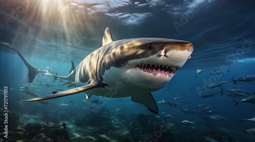 Obraz premium White shark open toothy dangerous mouth with many teeth.Clear water shark swims. Generated AI