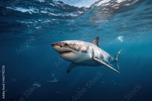 © ryker, Naklejka premium White shark swimming gracefully in deep blue sea, showcasing its powerful presence and sleek body. sunlight filters through water, creating serene underwater atmosphere