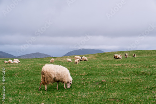 © VolodymyrNadtochii, Fototapeta premium White sheep graze on a green pasture with mountains in the background