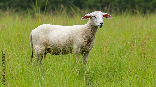 © Windi, Obraz premium White sheep grazing pasture, summer field, farm animal