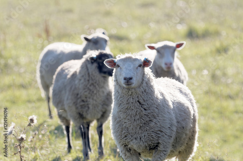 Fototapeta premium White sheep on a meadow in the warm evening sun