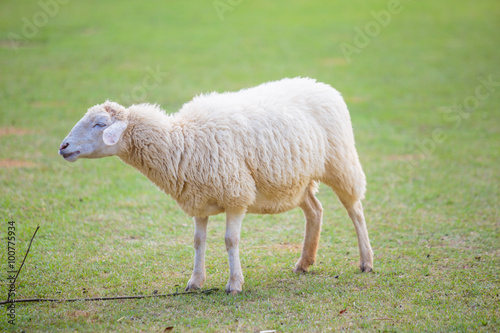© Phongsak, Obraz premium White sheep on green grass field.