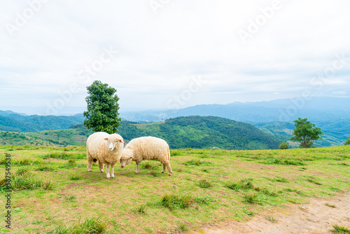 © topntp, Obraz premium white sheep on mountain hill