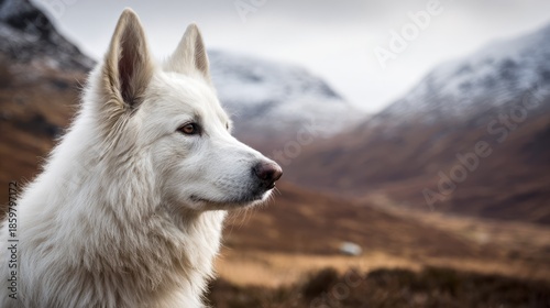 © Andrii , Obraz premium White Shepherd Dog Portrait in Mountain Landscape with Soft Natural Light