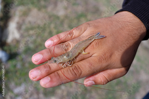 Fototapeta premium white shrimp, Litopenaeus vannamei, with a background of a cultivation pond