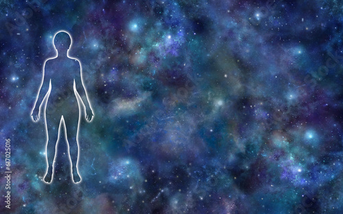 Fototapeta premium White silhouette female figure template - centrally placed against a deep space night sky celestial universe background ideal for spiritual energy healing theme with copy space