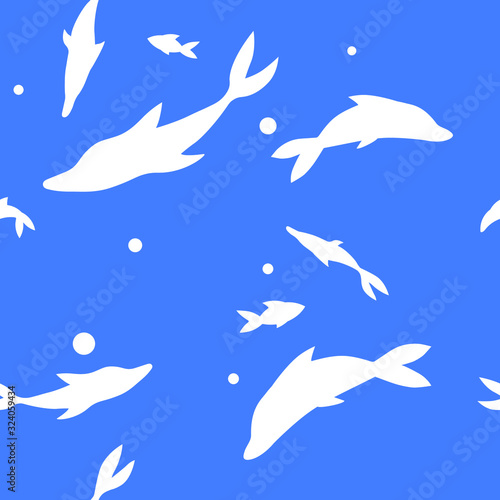 © Irina, Fototapeta premium white silhouettes of dolphins on a blue background, vector pattern for children, stencil