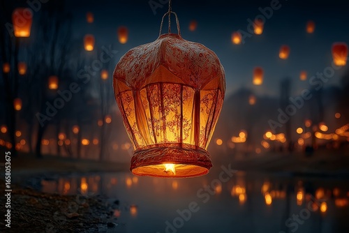 © Xiaoxiao, Obraz premium White sky lantern glowing and floating in night sky with other lanterns flying overhead against black background.