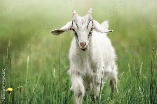 © Linas T, Obraz premium White small goatling outdoors, rural wildlife photo