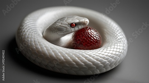 © kaiserseeing, Fototapeta premium White Snake Coiling Around Red Sphere on Gray Surface
