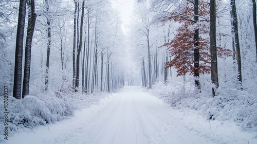 Naklejka premium White snow covers the forest trees and roads, creating a winter wonderland.