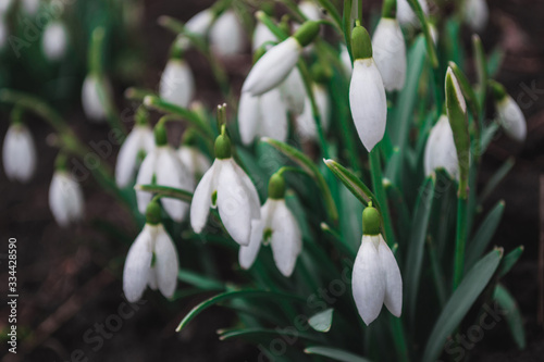© Eugene B-sov, Fototapeta premium White snowdrops closeup with blurred background