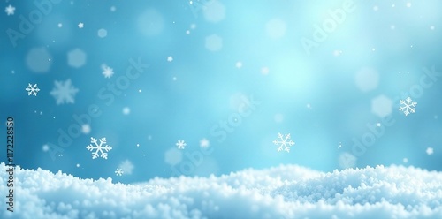 Fototapeta premium White snowflakes gently falling on a light blue background, wintry ambiance,