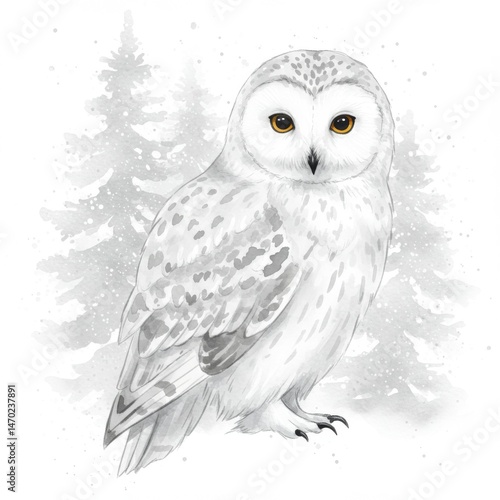 Fototapeta premium White Snowy Owl in Winter Forest Watercolor Painting