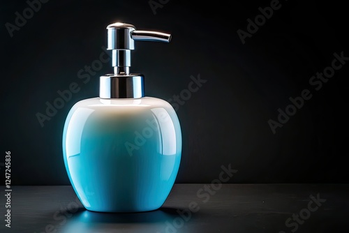 © sanom, Obraz premium White Soap Bottle Blue Dispenser Black Background Conceptual Photography
