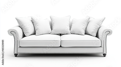 © Neelam, Obraz premium White sofa with pillows isolated on white background, 3D render