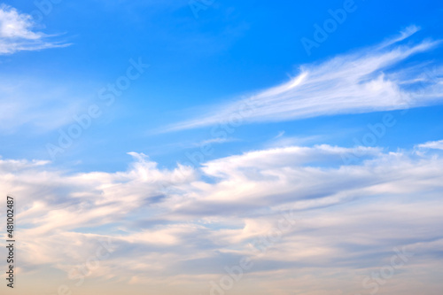 Obraz premium White soft clouds on a clear calm sky, cloudscape copy space