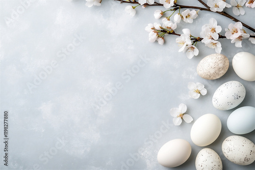 © Viktoriya, Fototapeta premium White speckled Easter eggs and blooming cherry blossoms arranged on a pastel gray background