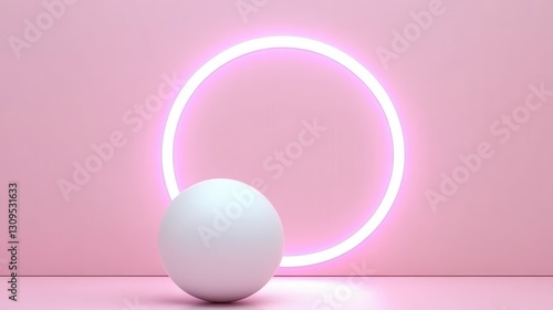 Obraz premium White sphere and pink neon circle on pink background. Minimalist product display scene. Simple geometric shapes. Soft lighting.