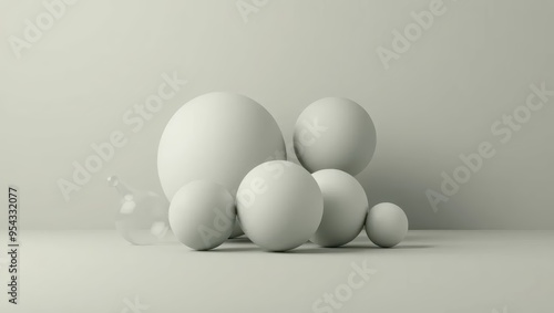 © Cornflakesei, Fototapeta premium White Spheres and Glass Orb on White Background