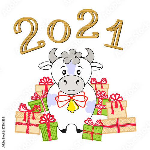 © KuraitennoDesign, Obraz premium White spotted bull with a bell among the gift boxes and lettering 2021 on a white. New Year 2021 of the ox, bull, cow. Vector design template for Christmas and New Year banner, poster and calendar