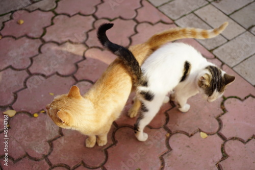 Fototapeta premium White spotted cat and ginger cat hugs and walk in a sunny autumn day