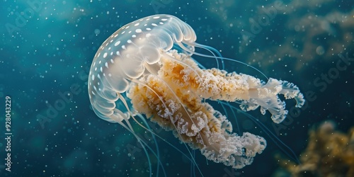 © AkuAku, Fototapeta premium White spotted Jellyfish Phyllorhiza punctata Large translucent jellyfish with white spots and trailing oral arms typically found in warm coastal waters and primarily feeds on zooplankton