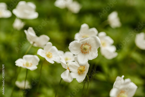 © Parfenova, Obraz premium White spring anemone flowers on a blurry green background in the spring garden