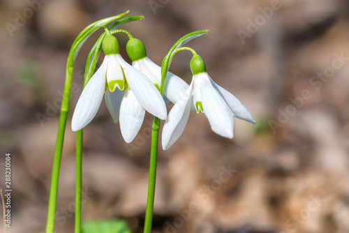 Fototapeta premium White spring flowers snowdrops in the forest, macro shot